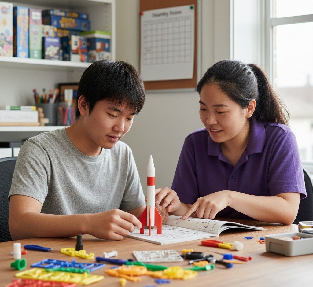 A young adult with autism focusing on a planned, stimulating activity with dedicated support.