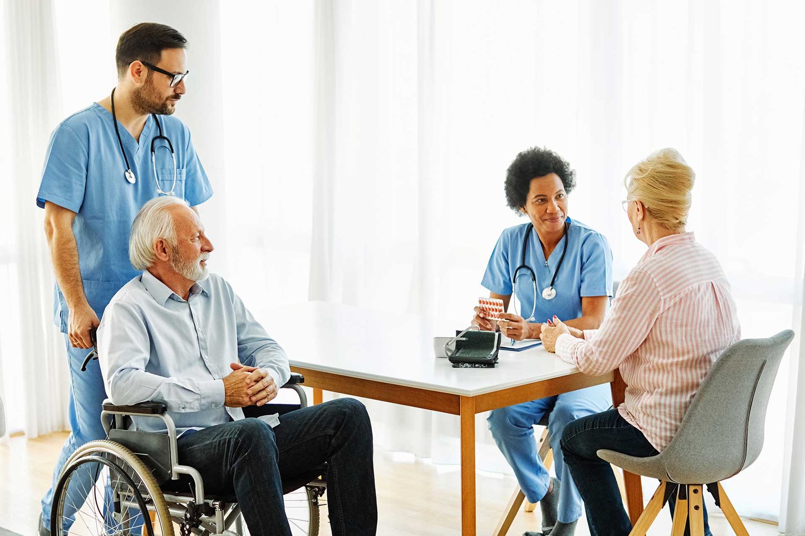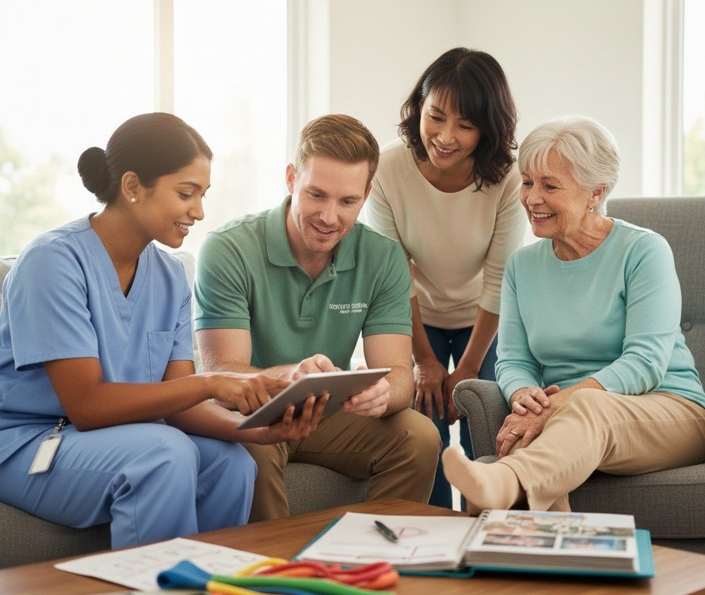 Our dedicated team, including family, discussing and planning tailored, comprehensive support.