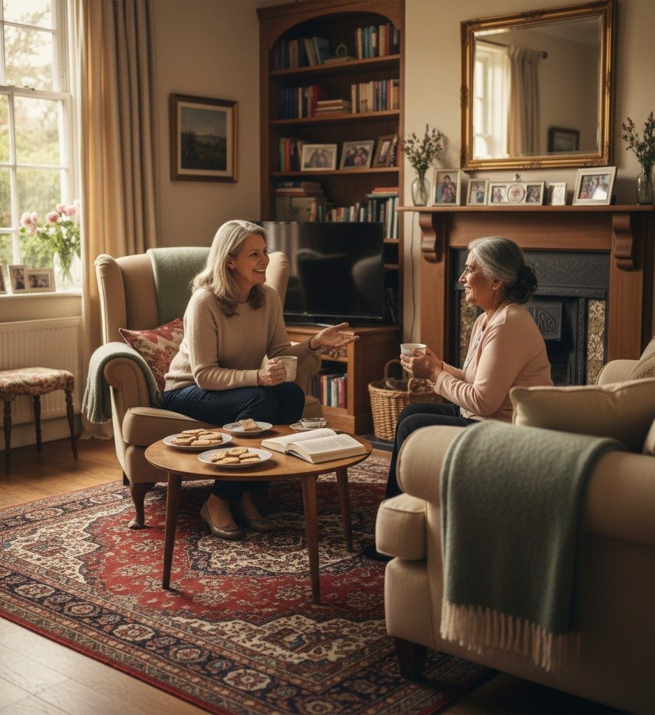 Enjoying meaningful conversation and companionship in a comfortable living room setting.