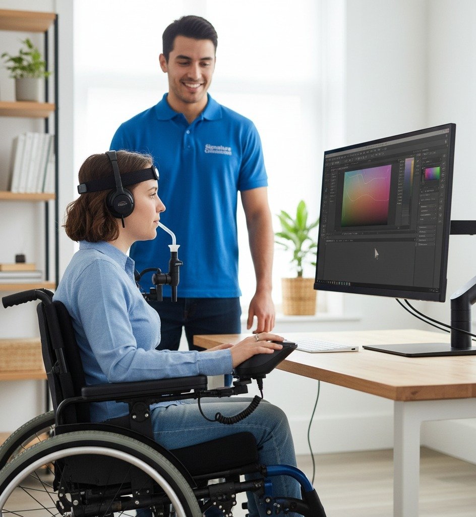 Using assistive technology to communicate and connect, with a support worker ready to help.